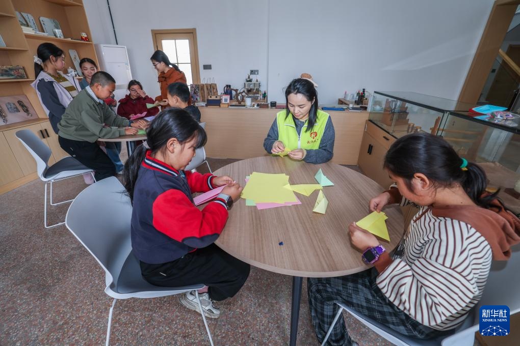11月12日,在長興縣泗安鎮羅家地村的愛心驛站里,學生們在社工的帶領下參加折紙活動。
