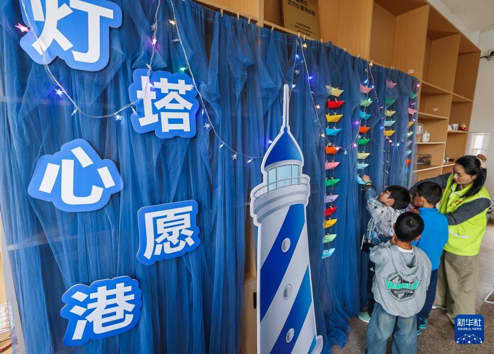 11月12日,在長興縣泗安鎮羅家地村的愛心驛站里,學生們把折好的彩色紙船掛在心愿墻上。