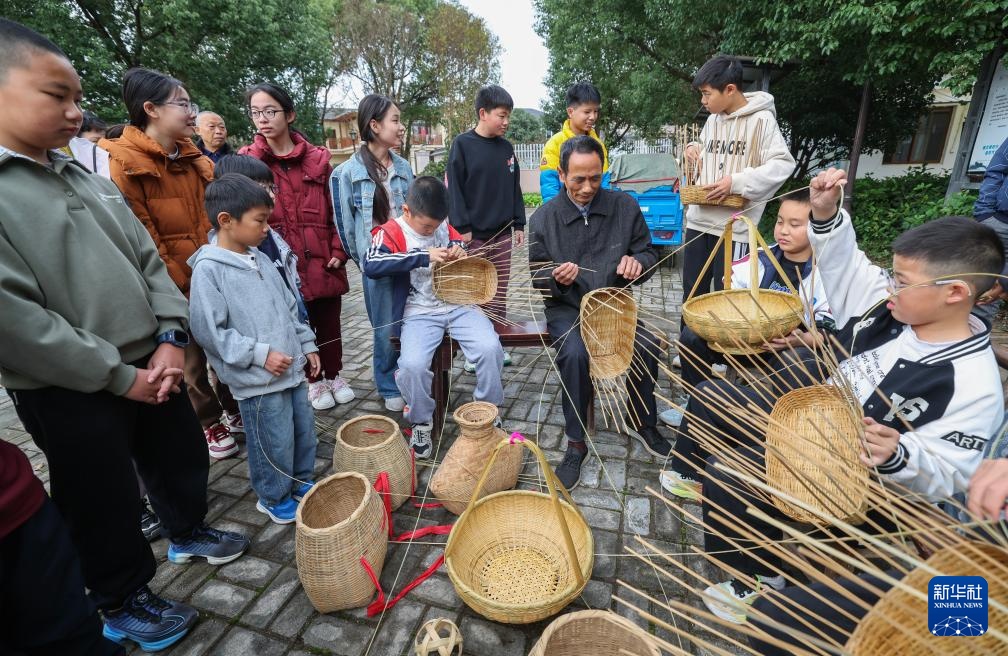 11月12日,在長興縣泗安鎮羅家地村的文化廣場,學生們在竹編藝人的帶領下學習竹編技藝。