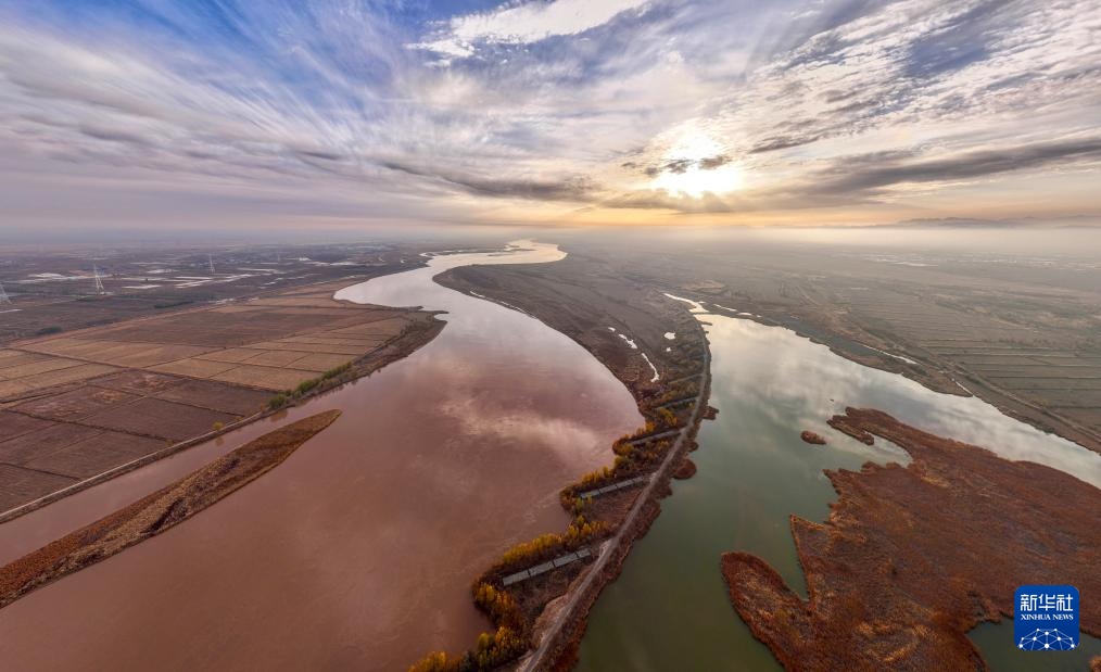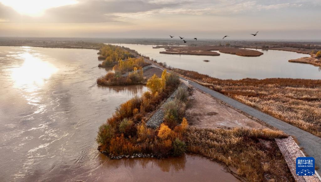 這是11月11日拍攝的寧夏平羅天河灣國家濕地公園(右)和黃河(無人機照片)。