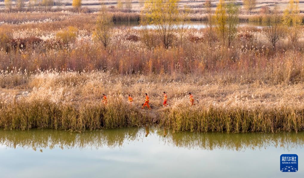 11月11日,工作人員在寧夏平羅天河灣國家濕地公園內巡查(無人機照片)。