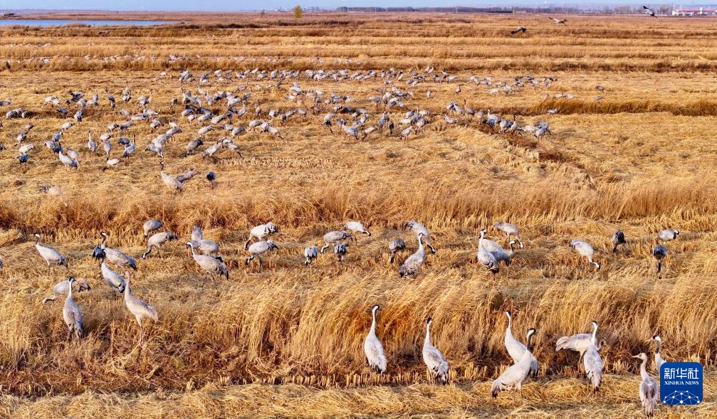 11月8日,候鳥在寧夏平羅天河灣國家濕地公園棲息覓食(無人機照片)。
