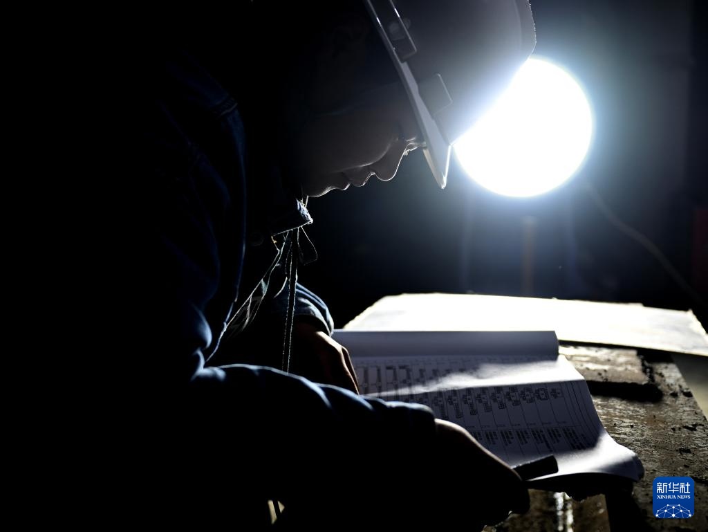 11月13日,工作人員在平漯周高鐵湛葉舞特大橋C段連續梁合龍施工現場查看施工圖紙。