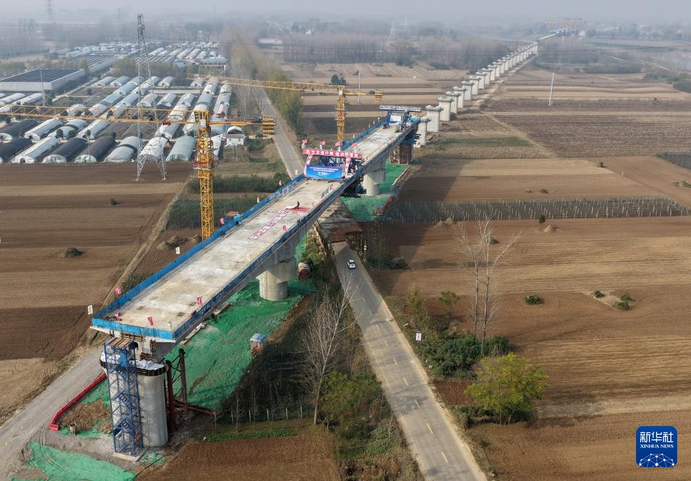 11月13日拍攝的合龍后的平漯周高鐵湛葉舞特大橋C段連續梁(無人機照片)。