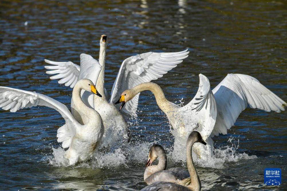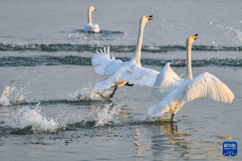 11月13日,白天鵝在山西平陸黃河濕地嬉戲。