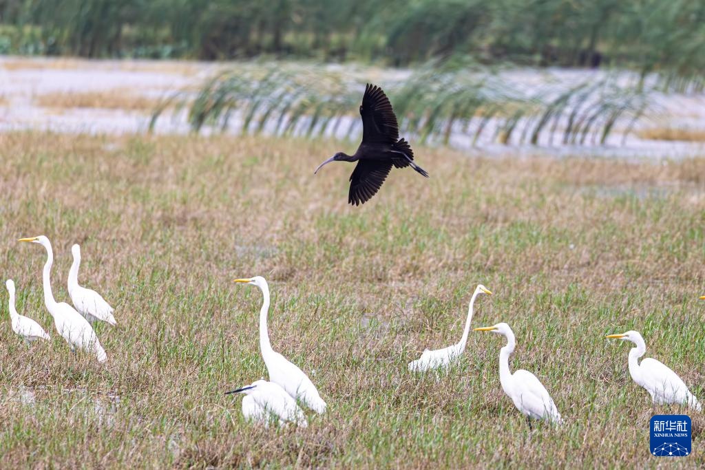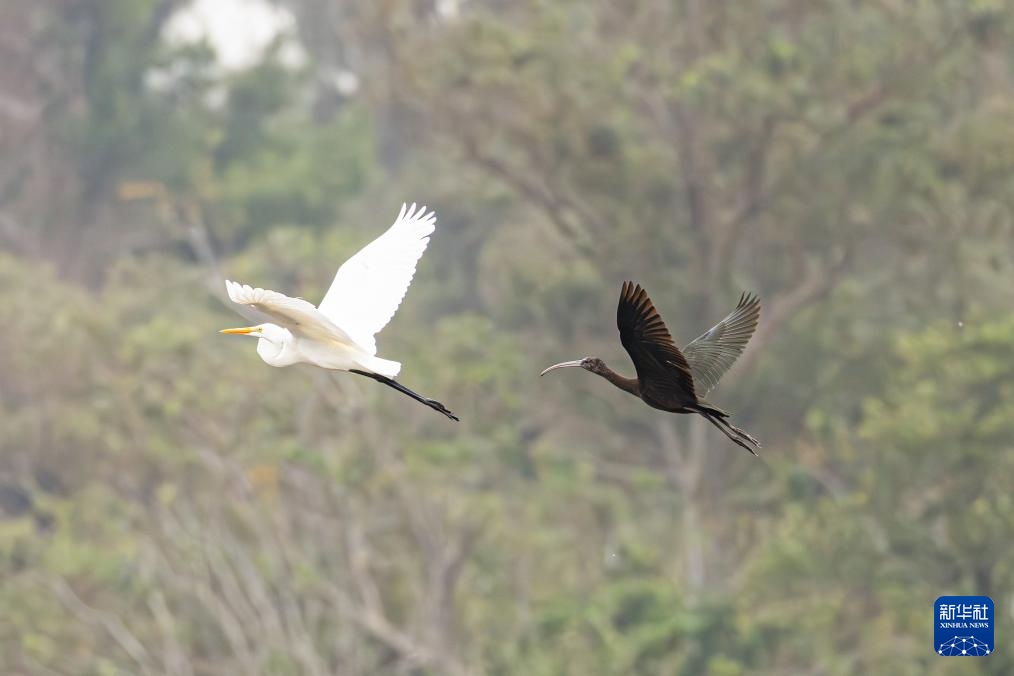 彩鹮(右)與鷺鳥在海南昌江海尾國家濕地公園齊飛(11月5日攝)。