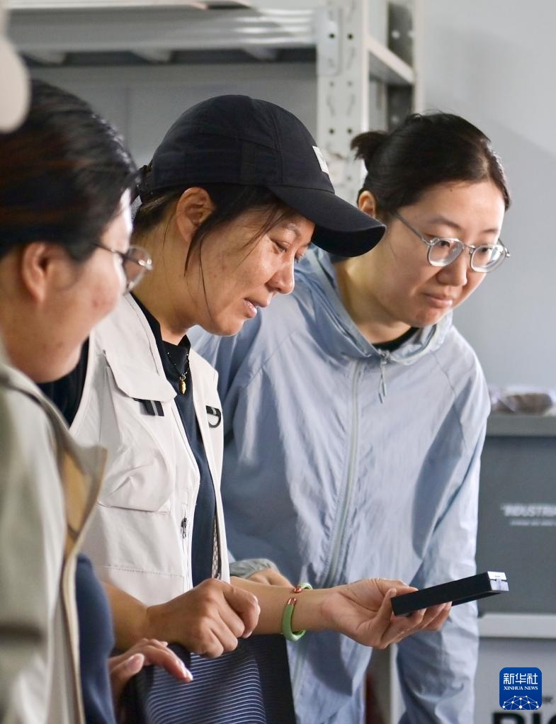 9月28日,于懷石(中)和同事在位于遼寧朝陽的牛河梁工作站內查看出土的文物。