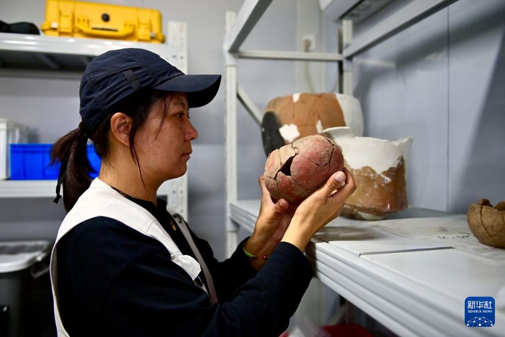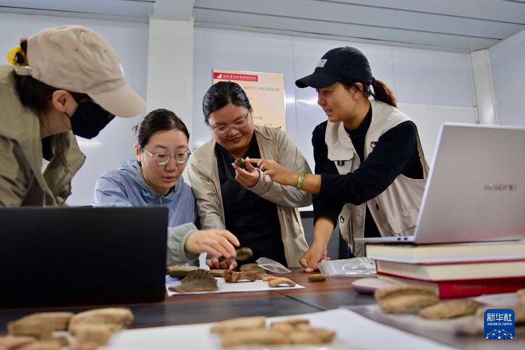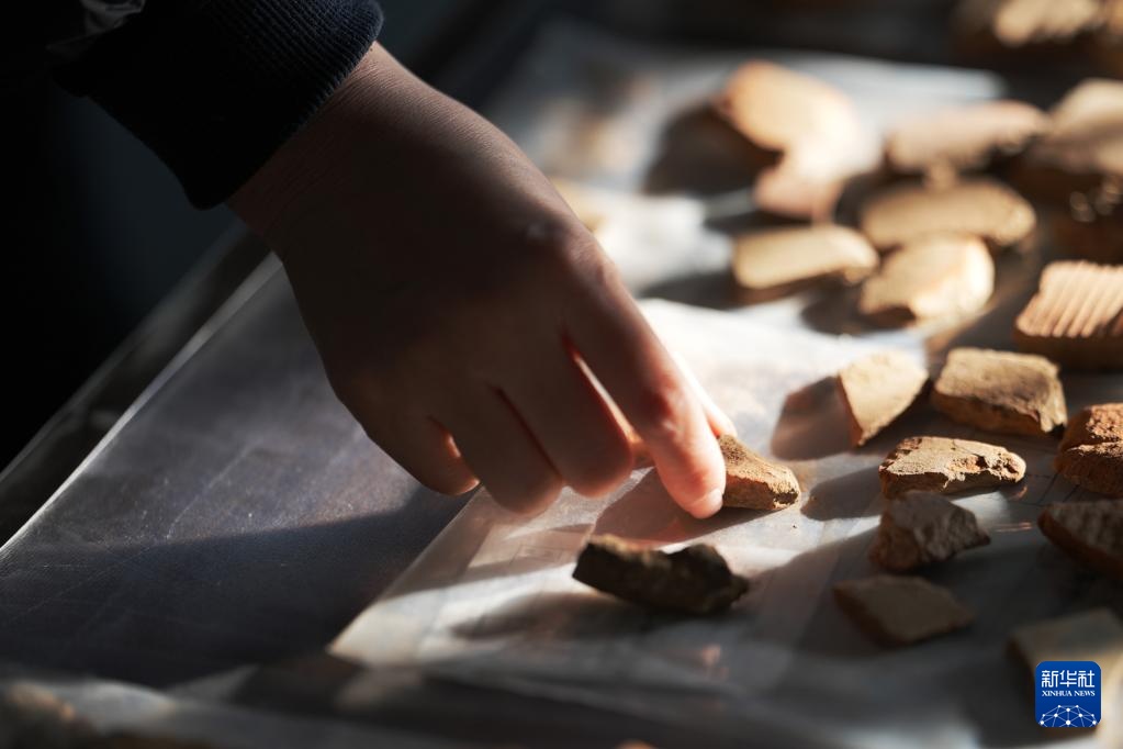 10月23日,工作人員在位于遼寧朝陽的牛河梁工作站分揀陶片。