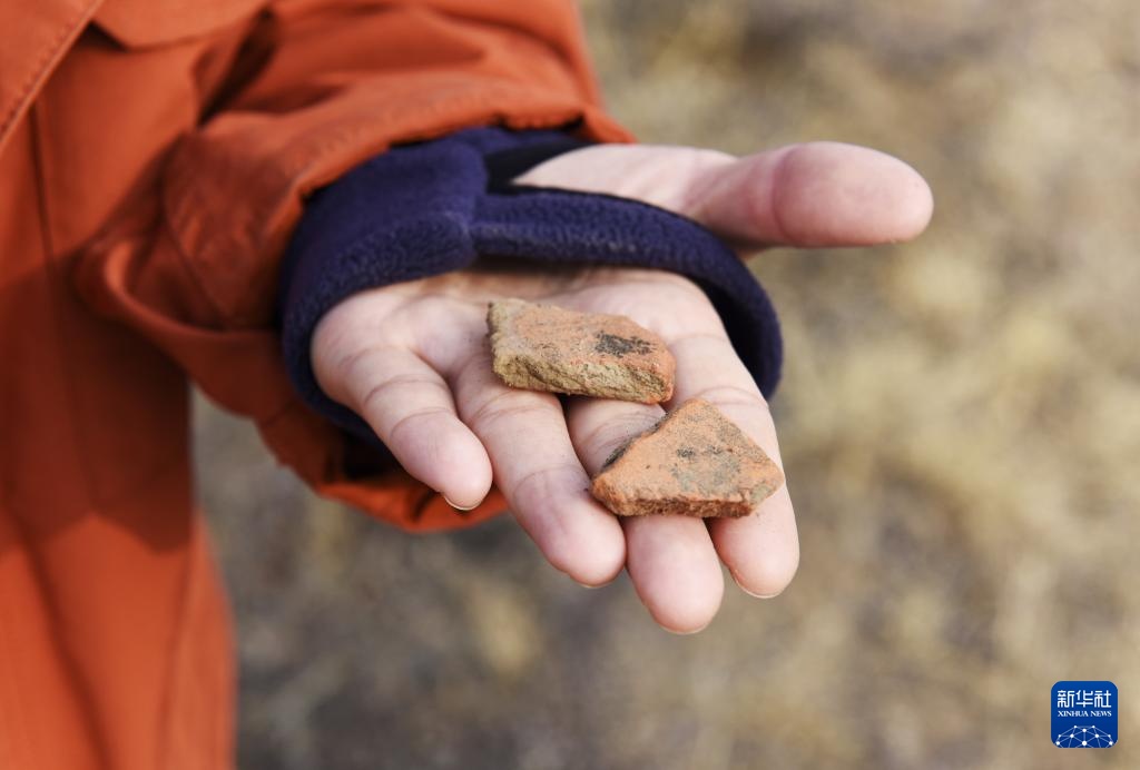 3月11日,在遼寧省朝陽市雙塔區,于懷石展示在調查現場發現的碎陶片。