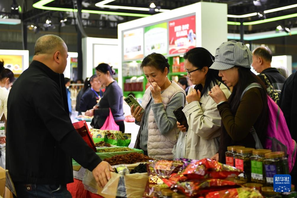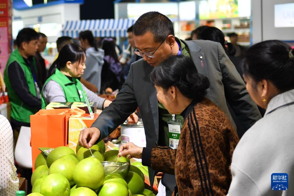 11月14日,觀眾(右)在第二十六屆中國中部(湖南)農業博覽會上挑選商品。