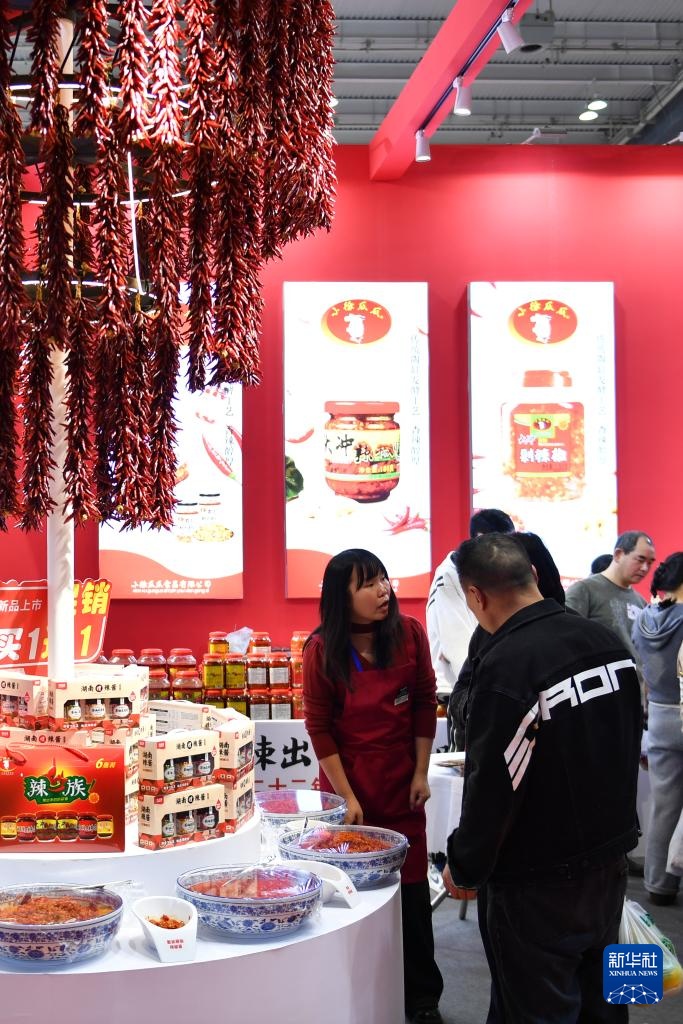 11月14日,在第二十六屆中國中部(湖南)農業博覽會上,參展商(左)向觀眾介紹商品。