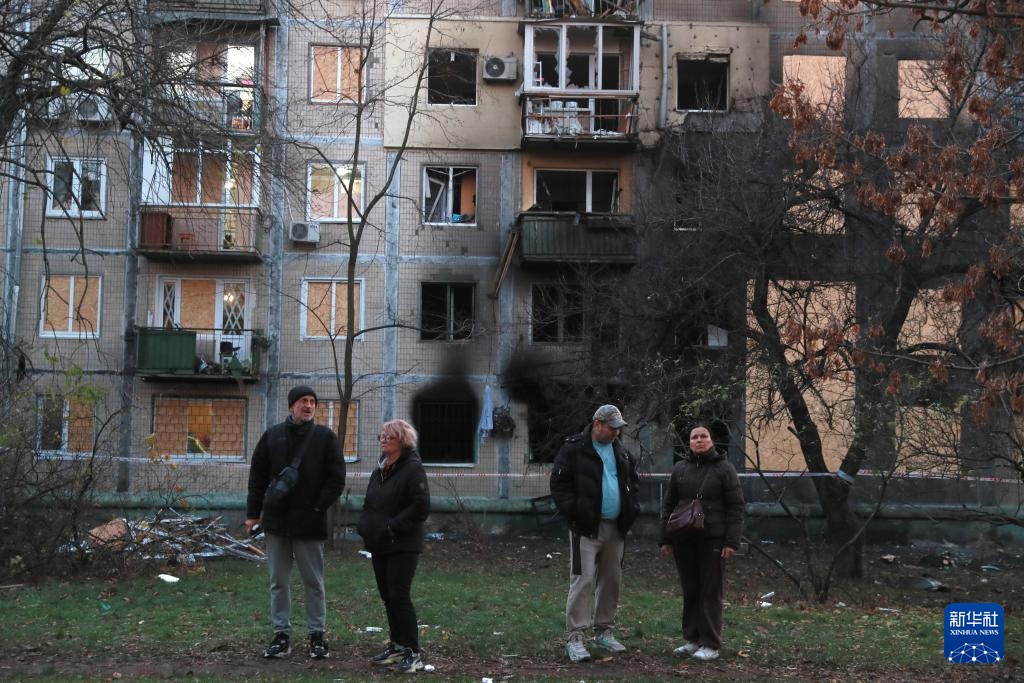 11月14日,在烏克蘭首都基輔市第聶伯區,當地居民站在遭受空襲損毀的房屋前。