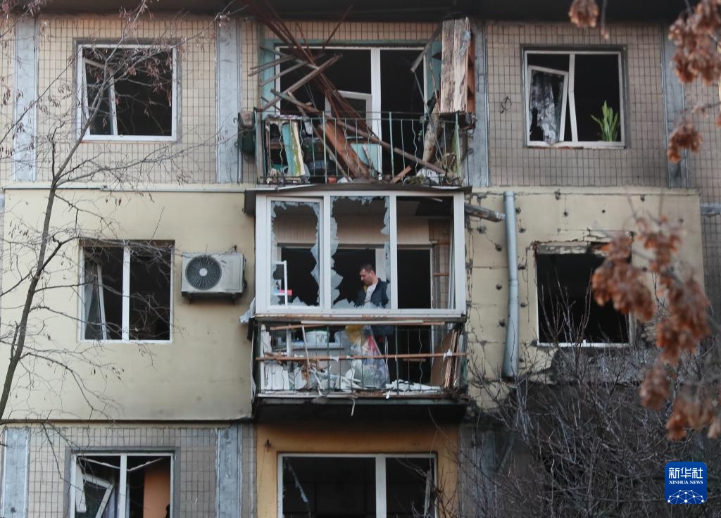 11月14日,在烏克蘭首都基輔市第聶伯區,當地居民對遭受空襲損毀的房屋進行清理。