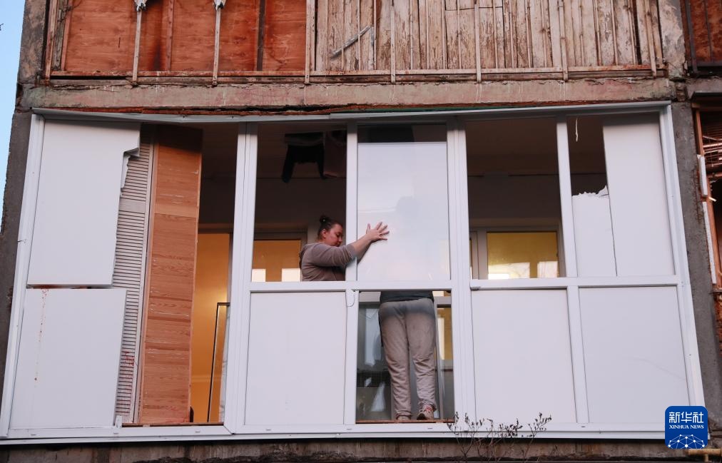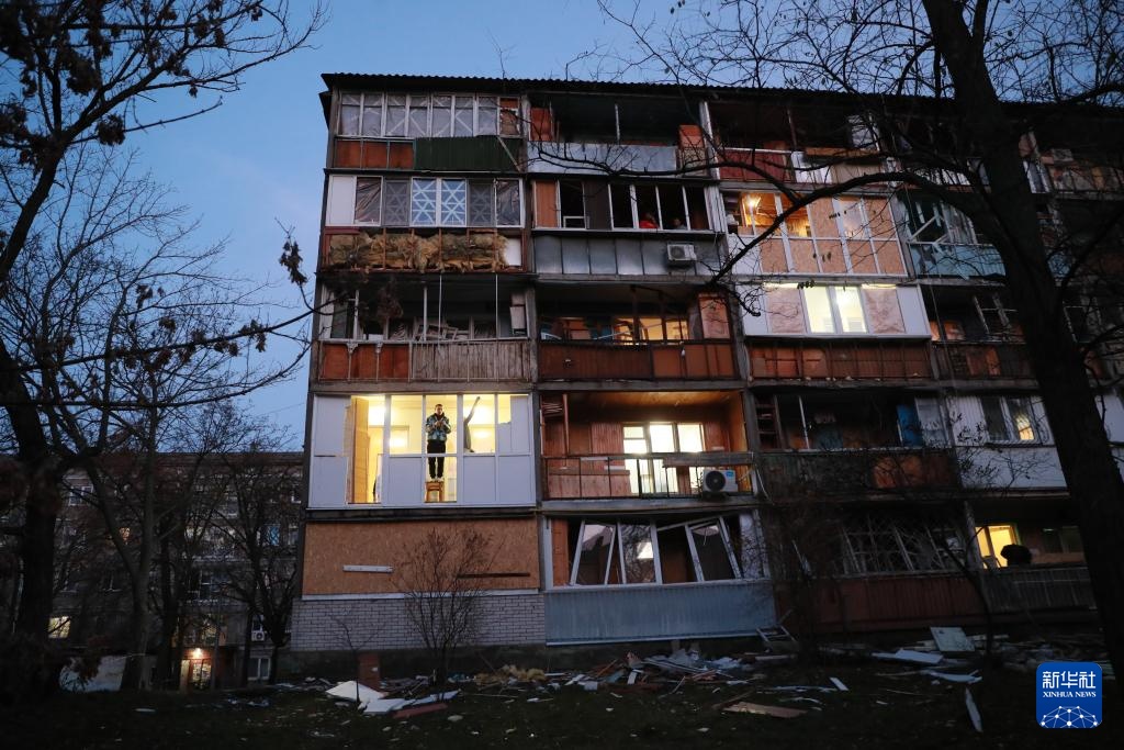 11月14日,在烏克蘭首都基輔市第聶伯區,當地居民對遭受空襲損毀的房屋進行修繕加固。