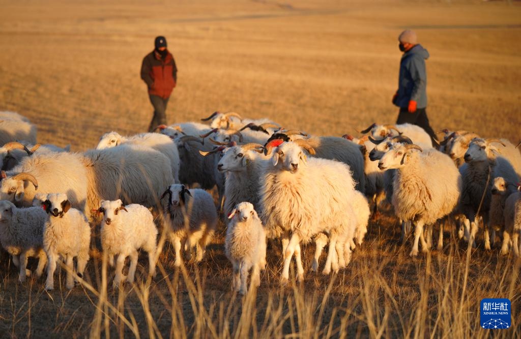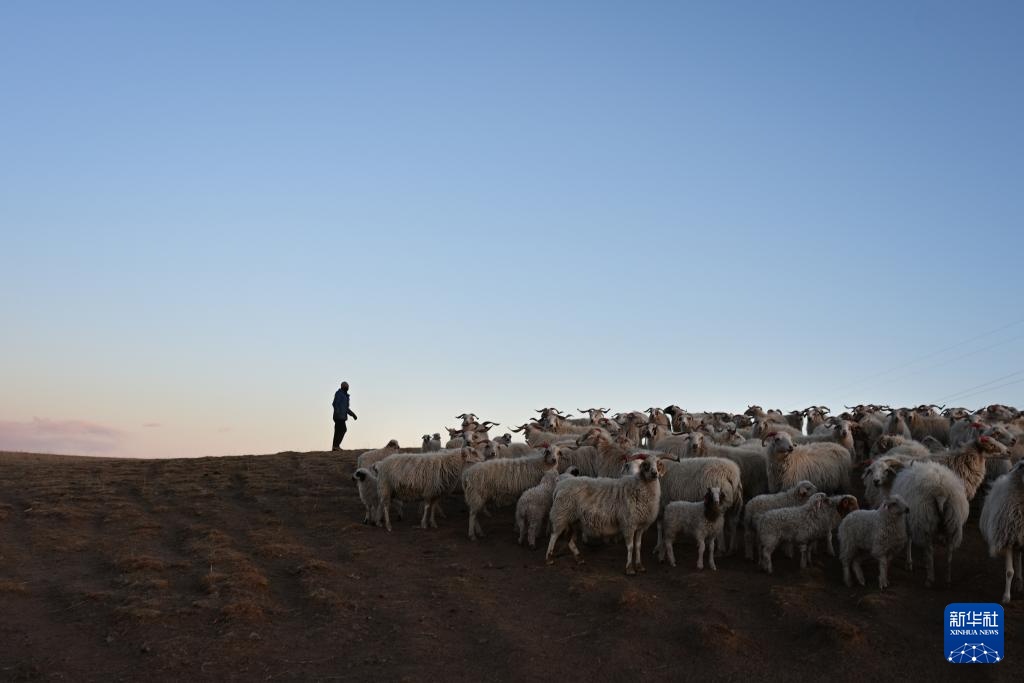 11月13日,在青海省海北藏族自治州剛察縣泉吉鄉寧夏村草場,牧民才保領著羊群返回圈舍。