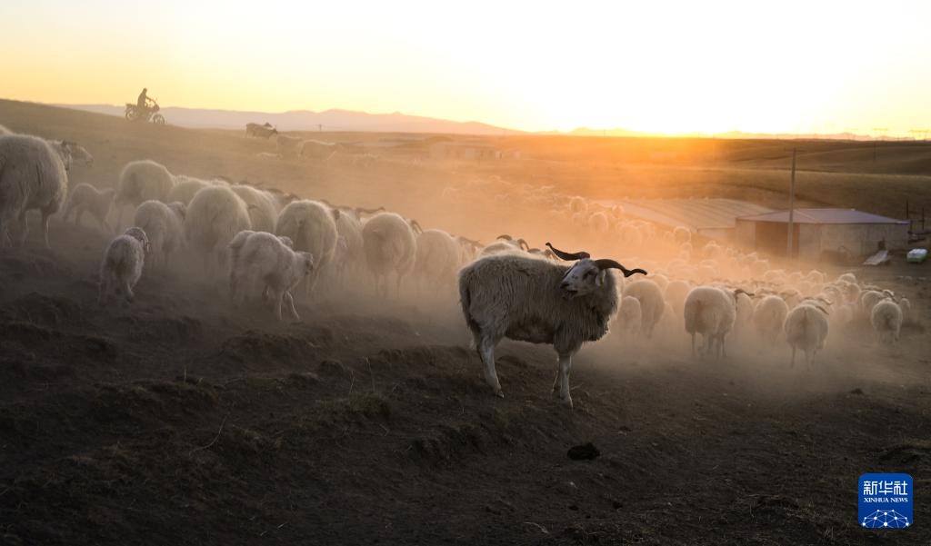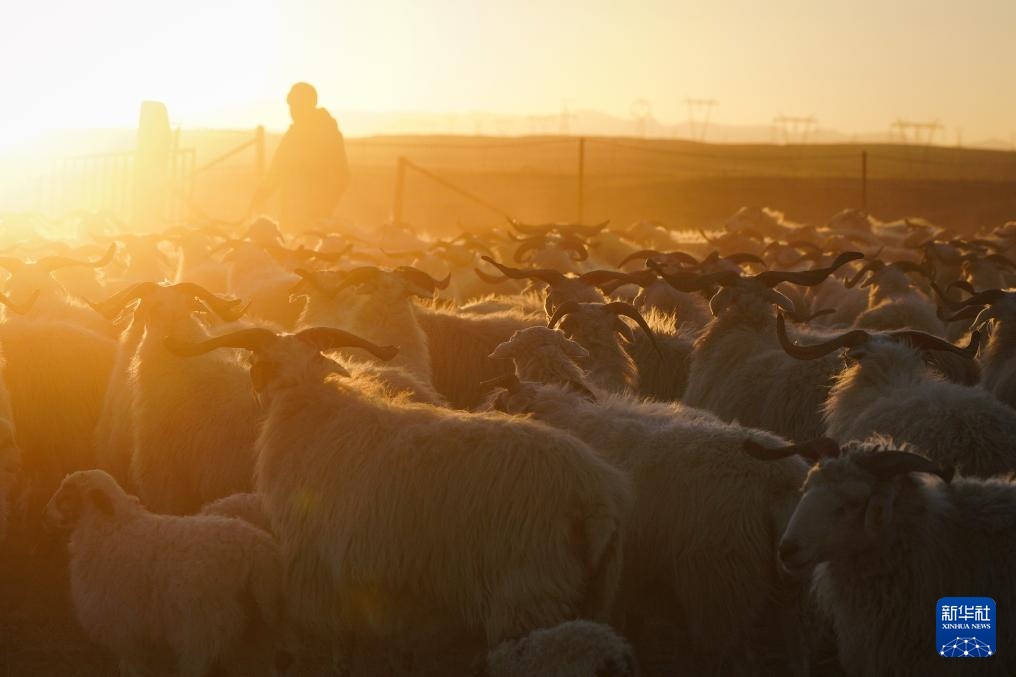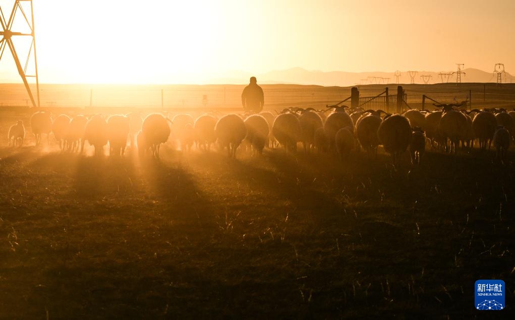 11月13日,在青海省海北藏族自治州剛察縣泉吉鄉寧夏村草場,牧民將羊群趕回羊圈。