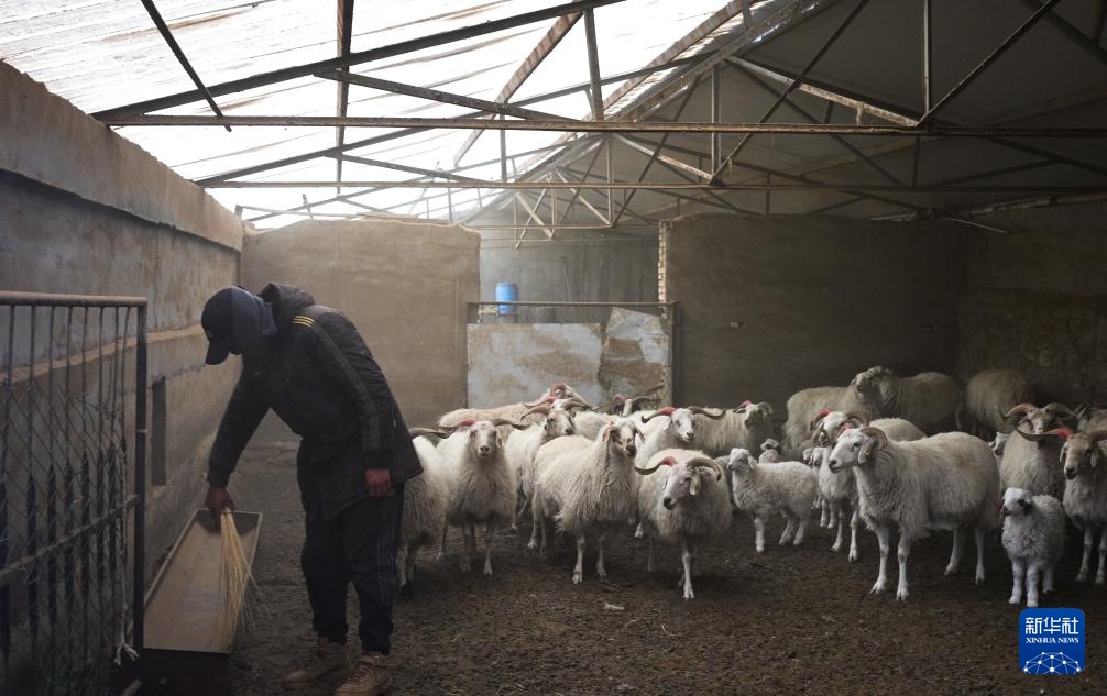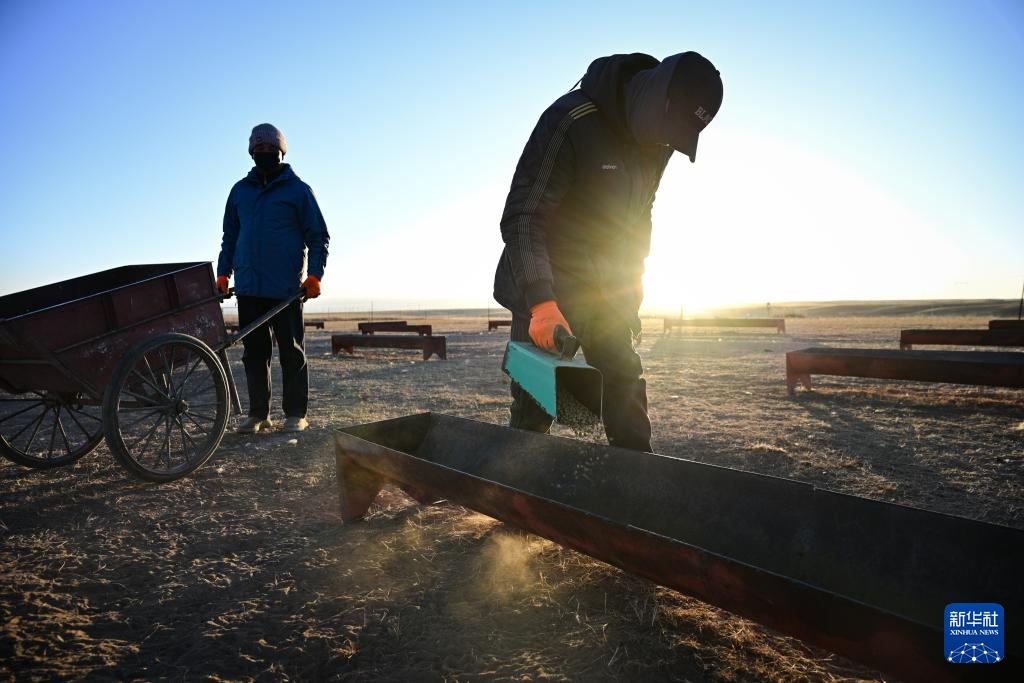 11月13日,在青海省海北藏族自治州剛察縣泉吉鄉寧夏村草場,牧民拉保(右)在為羊群補飼。