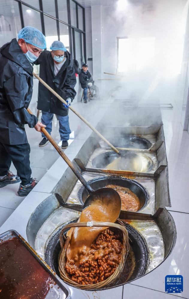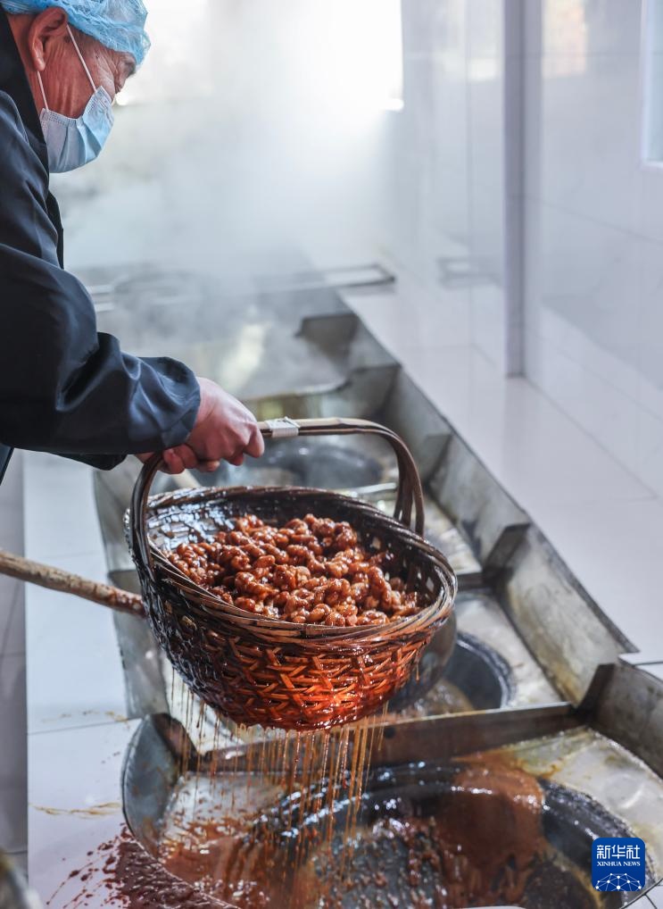 11月15日,義烏市城西街道上楊村銘悅紅糖廠的工人將濃稠的糖蔗汁澆到麻花上,制成義烏的傳統紅糖美食——紅糖麻花。