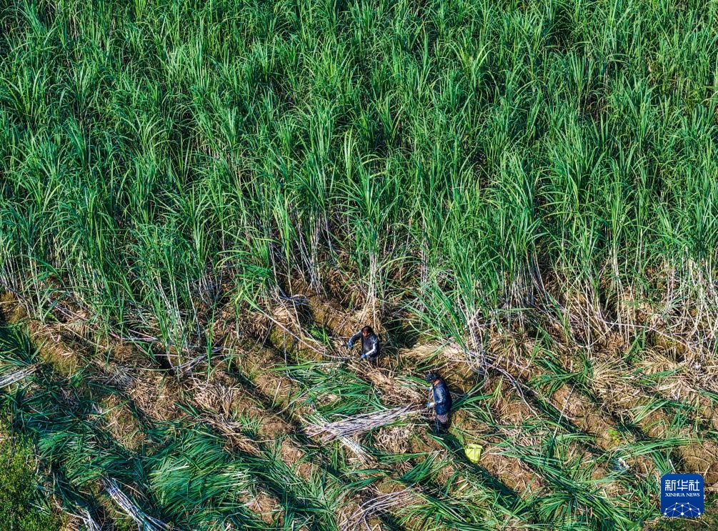 11月15日,工人在種植園中收獲成熟的糖蔗,這是當地制作傳統紅糖的原材料(無人機照片)。