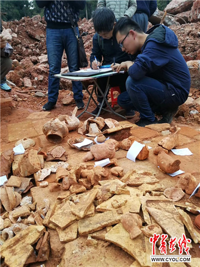 現(xiàn)場(chǎng),考古人員正在測(cè)量墓穴大小,標(biāo)記隨葬品數(shù)量和位置,繪制墓穴的平面圖。工作人員初步判斷,很大可能是漢墓,具體還有待進(jìn)一步確定。在一處呈三角形的墓穴里散落著數(shù)十件古物,有十多個(gè)罐狀器皿和蓋子,還有一些牛、雞等動(dòng)物形狀的物品。現(xiàn)場(chǎng)考古人員還撿出了一些大塊的碎片,推測(cè)是墓志銘,但已遭到破壞,一時(shí)無(wú)法辨認(rèn)上面的文字。