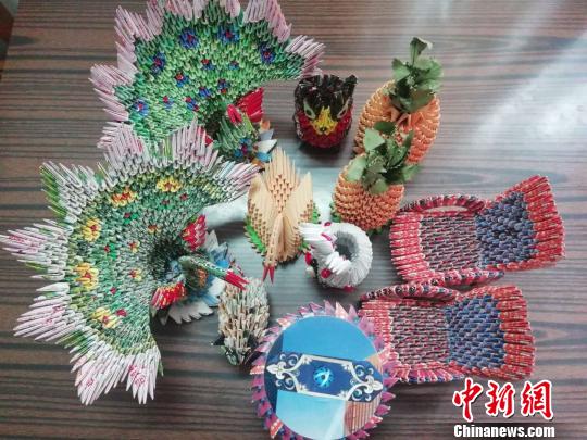除了布貼畫,周鐘英還擅長折紙作品。在采訪現(xiàn)場,周鐘英向記者展示了上千個(gè)折紙“三角插”小零件。這些小零件被重新構(gòu)思和組合后,變成了桌椅、沙發(fā)、水果等精致的工藝品。她表示,這些作品全部都是用搜集的廣告紙和復(fù)印紙折成。