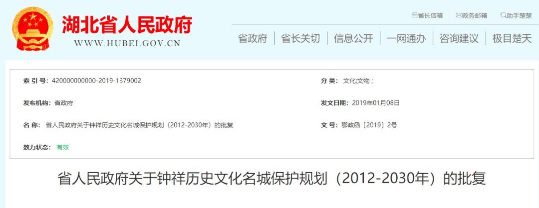 批復中提到,原則同意《荊門歷史文化名城保護規劃(2017-2030年)》、《鐘祥歷史文化名城保護規劃(2012-2030年)》。