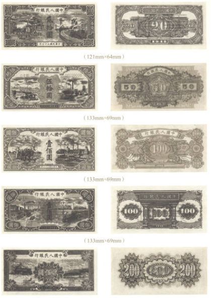 這是中國人民銀行分別于民國三十七年、民國三十八年,即1948年、1949年發行的第一套人民幣各種票樣。