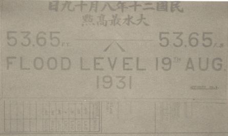 在1931年江淮流域大水災中,武漢三鎮是受災最嚴重的城市。1931年入夏以后,長江流域各省普降暴雨,連綿經月。湖北境內江河湖泊水位猛漲。8月19日,江漢關水位達53.65英尺(16.35米),創漢口建立水文站以后六七十年間最高洪水紀錄。該份檔案真實地記載了“民國二十年八月十九日(公元1931年8月19日)大水最高點53.65英尺”、下面是英文“1931年8月19日水位”。這是漢口1931年大洪水水位最高點最權威的記錄。