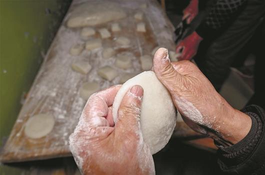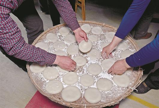 趁著熱乎勁,八位村民一齊動手制作糍粑。20分鐘后,120個手工捏成的圓餅狀糍粑,整整齊齊擺在竹簸箕里。一個星期后,晾干的糍粑會被放進清水浸泡,吃的時候撈幾塊出來,一直可以吃到明年開春。“現在城里賣的糍粑,大都是機器壓制的,比較軟,沒有手工糍粑有嚼頭。”陳勇說。他覺得自己打的糍粑更好吃,就是比較費工夫。在外地上學的兒子和女兒馬上就要回家過春節了,他得提前把糍粑準備好,到時或煎、或烤、或煮給他們吃,一家人過個團圓年。