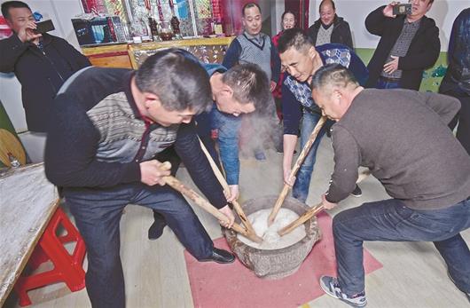 “嘿嘿……嘿嘿……”1月27日下午2時許,武漢市新洲區汪集街最北端的太和村,響起整齊的號子聲。村民陳勇夫婦和十多位鄉親,輪流上陣打糍粑,迎接豬年春節的到來。