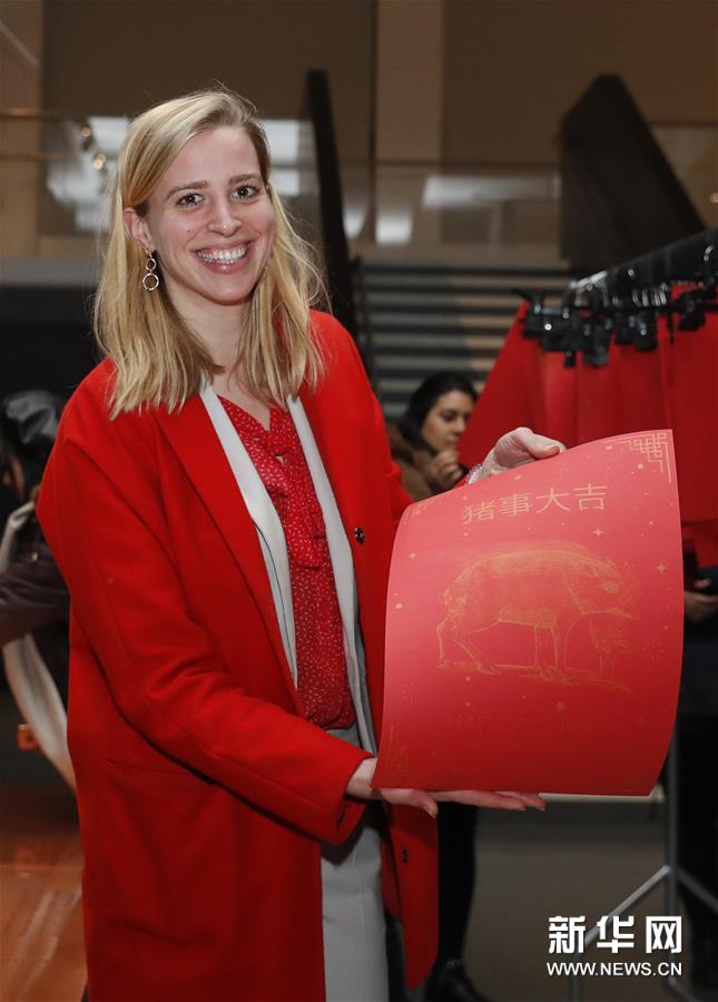 1月30日,在英國倫敦的科學(xué)博物館,一名參觀者展示親手制作的迎春招貼畫。新華社記者韓巖攝