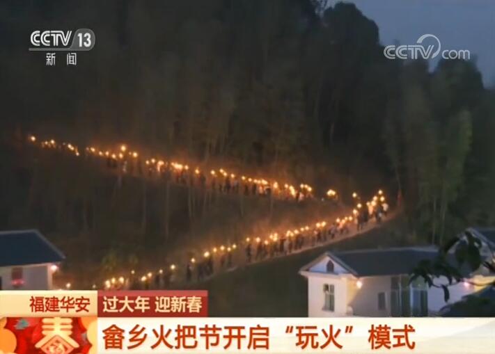 在福建華安縣高安鎮坪水村,到處張燈結彩,一片喜慶氛圍。畬鄉火把節吸引了八方來客,慕名而來的游客和村民陸續點燃手中的火把,排起長隊穿梭在山上,宛如一條百米長龍,遠處望去流光溢彩、美不勝收。隊伍所經過的人家,煙花禮炮齊放,璀璨奪目。大家歡聚在美麗的村寨,觀看畬族傳統歌舞,共度新春佳節。