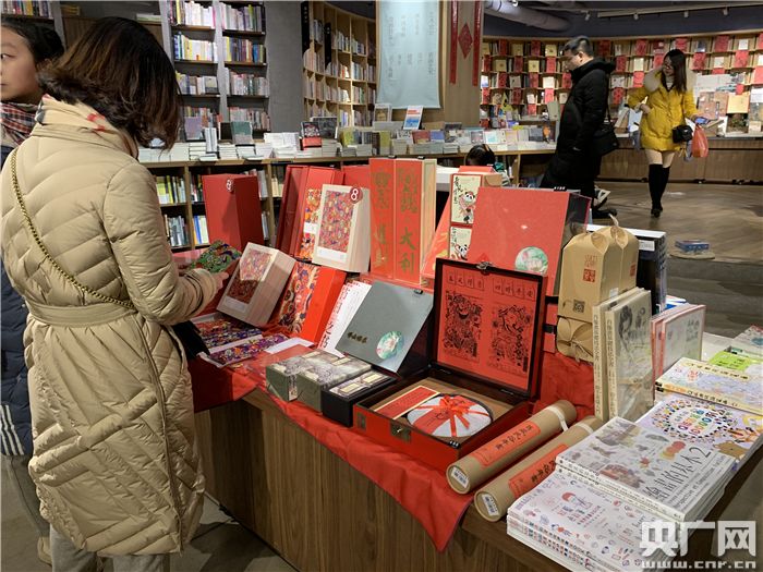 2月8日,正月初四,青島方所書店內,顧客正在欣賞以春節為主題的年畫周邊產品。(央廣網記者 孫冰潔 攝)