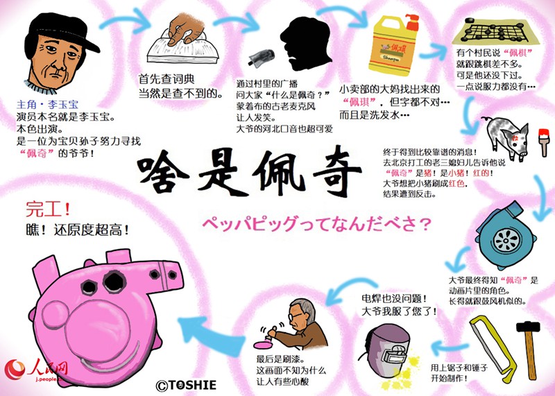 英國動畫片《小豬佩奇》的中文電影《小豬佩奇過大年》已在春節期間上映。上映前夕,這部電影的宣傳視頻《啥是佩奇》引發了人們的熱議。視頻中,家住農村的爺爺打電話問孫子想要什么新年禮物,孫子回答說“我要佩奇!”但爺爺卻不知道 “佩奇”為何物。一頭霧水的爺爺幾經尋找,才終于明白了究竟“啥是佩奇”,并制作了特別的“佩奇”送給了孫子。這個小小的短片融入了春節、回家、故鄉的老人、親情等多個元素,深深打動著中國觀眾的心。(文·圖/玄番登史江、袁蒙)