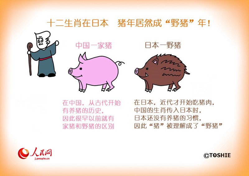 提到“豬年”,在中國,人們一般聯想到的是家豬,但在日本卻是野豬。其實家豬和野豬在生物學上的區別并不大,經過人類不斷地選育和馴化,適應野外生存的野豬變成了今天的家豬。在中國,自古就有養豬的歷史,因此很早以前就有家豬和野豬的區別。而在日本,人們在近代才開始吃豬肉。十二生肖傳入時,日本還沒有飼養家豬的習慣,因此便將“豬”理解成了“野豬”。