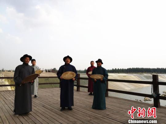 圖為端鼓腔傳承人丁立新及其團隊在湖邊表演端鼓腔?!√K本善 攝