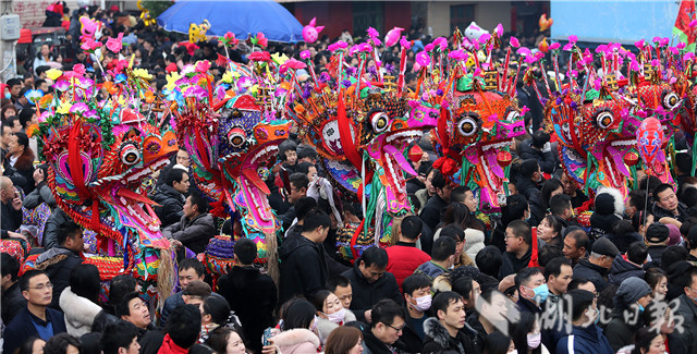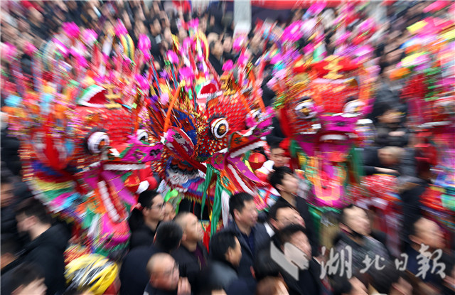 2月17日,湖北省孝感市孝南區楊店鎮群眾在集鎮中心舞龍燈喜迎元宵佳節。元宵佳節到來之際,湖北省孝感市孝南區楊店鎮龍騰燈舞鬧元宵,115條龍燈、96只獅子燈走街串村進行巡回展演,為人們送去新春祝福。(視界網代純攝)