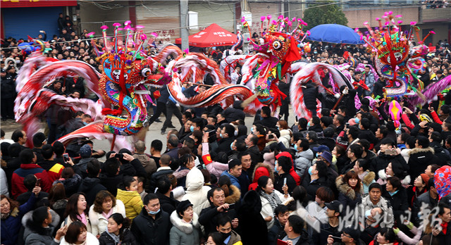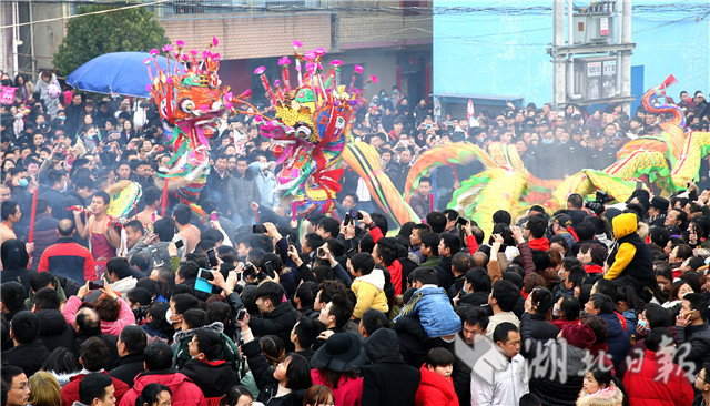 2月17日,湖北省孝感市孝南區楊店鎮群眾在集鎮中心舞龍燈喜迎元宵佳節。
