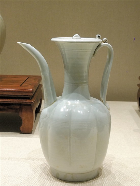 北宋湘湖窯青白釉瓜棱形腹執壺
