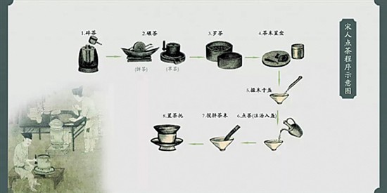 炙茶(用炭火烘焙茶餅)、碾茶(用碾磨將茶餅碾研成粉末)、羅茶(用絹羅篩茶,成均勻粉末)、候湯(選水與燒水)、熁盞(溫熱茶盞)、調膏(注入少量熱水拌和茶末,調成膏狀)、點茶(沖注熱水入盞)、擊拂(用茶筅調勻茶水,并擊出茶沫),程序井然。在南宋劉松年的《攆茶圖》中,這一套嫻雅的宋代點茶規制得以呈現,常被引用。