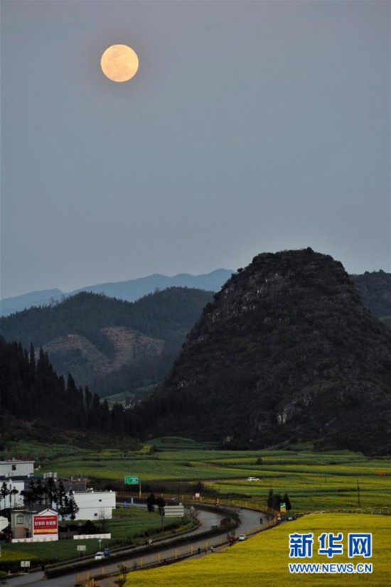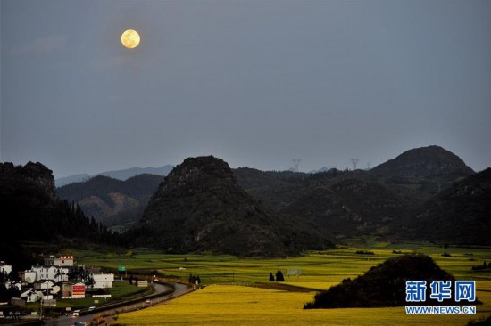 2月19日,一輪圓月從云南省羅平縣金雞峰叢開滿油菜花的山間升起。 新華社記者 秦晴 攝