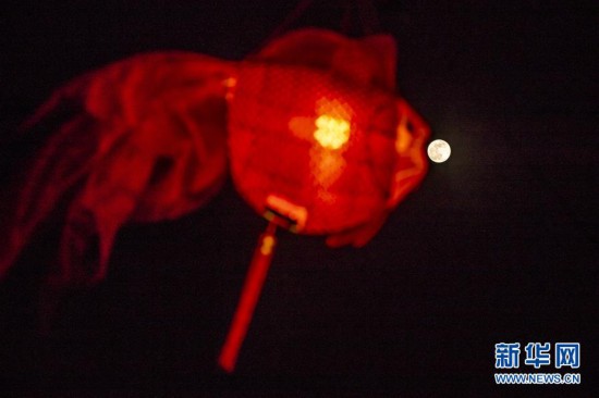 2月19日晚,在北京景山公園舉行的元宵燈會活動上,魚形花燈與一輪皓月形成了“頑魚食月”的景觀。 新華社記者 沈伯韓 攝
