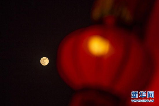 2月19日晚,在北京景山公園舉行的元宵燈會活動上,高掛的紅燈籠與一輪皓月遙遙相對。 新華社記者 沈伯韓 攝