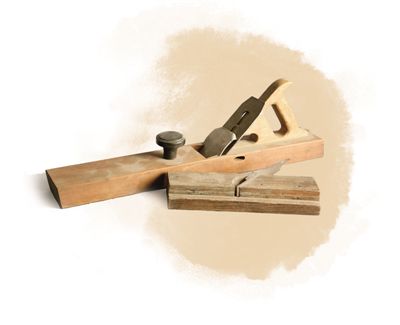 木料凡是做成光面,都要用到刨。刨的種類多,木匠一般要帶好幾種刨。粗平用粗刨,細平用細刨,削小圓棍還得用鳥刨。粗刨阻力很大,我試了一下,根本推不動。細刨就有意思,不但阻力小,聲音也好聽,刨一下,發出“噼——”的摩擦聲。我最喜歡長刨,一刨過去,一根長長的刨花就像絲帶一樣從刨眼上飄出來。我和妹妹天天蹲在工場上撿這種長刨花,我們用刨花做手鐲、項鏈。刨花散發出木頭的香氣,很好聞。