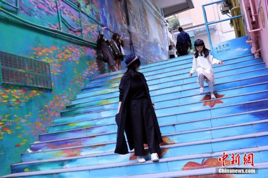 2月24日,不少游客蒞臨“藝里坊”拍照打卡。每年的三月,是香港藝術月,世界各地最熱門的藝術展覽齊聚香港,第47屆香港藝術節、巴塞爾藝術展、及街頭藝術節目將精彩紛呈。而在西環的“藝里坊”,鮮艶的涂鴉成為訪港游客的熱門打卡地方。位于西營盤的“藝里坊 ARTLANE”,多幅大型壁畫作品融入忠正街、奇靈里及石棧里,壁畫類型分布于墻壁、街道、樓梯和圍板,繪制了本地和國際藝術家的涂鴉壁畫作品,以紐約、倫敦、首爾等大都會的壁畫街作為靈感,將不同的藝術帶進西營盤社區,成為市民及游客新的打卡熱點。中新社記者 洪少葵 攝
