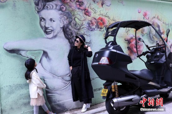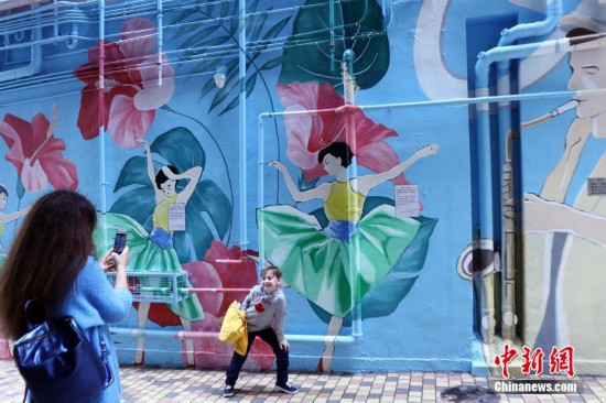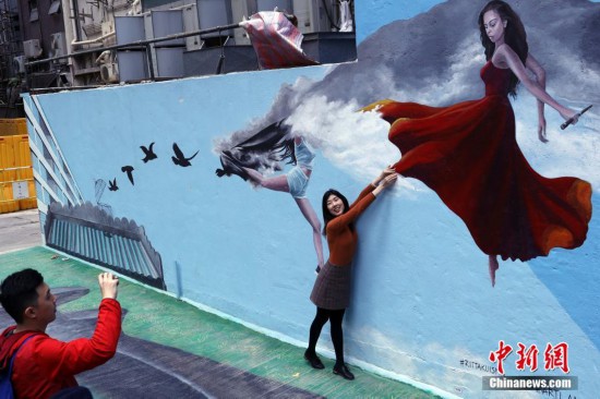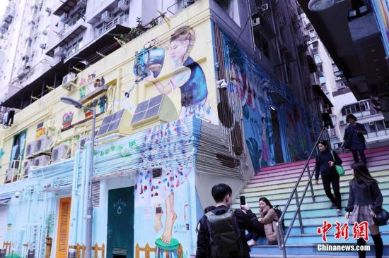 2月24日,不少游客蒞臨“藝里坊”大型壁畫下拍照。每年的三月,是香港藝術月,在香港西營盤的“藝里坊”,鮮艶的涂鴉成為訪港游客的熱門打卡地方。“藝里坊”這些高顏值得壁畫,給西環舊城區注入都市活力。中新社記者 洪少葵 攝
