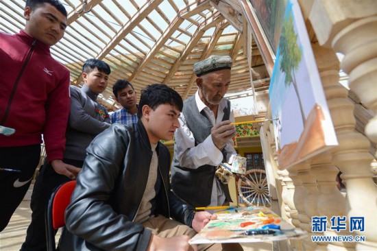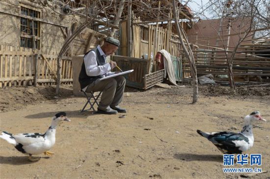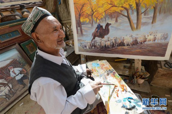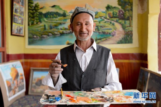 今年75歲的阿卜力克木·麥麥提敏是新疆墨玉縣扎瓦鎮庫木艾日克村土生土長的農民畫家。半個多世紀以來,他一邊勞動,一邊作畫,創作出1.5萬余幅作品。 自幼喜歡畫畫的阿卜力克木·麥麥提敏15歲時與油畫結緣。沒有老師,他從臨摹畫冊學起,色彩勾兌,如何上色,憑著自己的感覺反復琢磨,不斷用自己的畫筆描繪著大美新疆。 如今,阿卜力克木·麥麥提敏不僅能畫油畫、水彩畫,還能用油漆作畫,甚至在地毯上織繪自己的作品。2012年,在北京舉辦的全國農民畫家油畫展上,他的畫作《古代神話》榮獲二等獎。每年有眾多繪畫愛好者、美術專業的學生慕名而來,向他學習繪畫技巧。 “無論時光如何流轉,都不會消減我對藝術的追求。”阿卜力克木·麥麥提敏說,繪畫給他帶來無盡的快樂,希望今后能有更多的人拿起畫筆,描繪美好的生活和精彩的人生。
