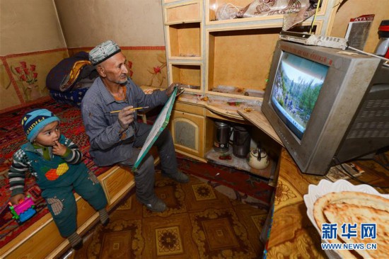 阿卜力克木·麥麥提敏通過看電視“采風”,積累繪畫素材(3月6日攝)。新華社發(丁磊 攝)