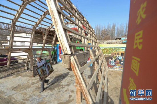 在新疆墨玉縣庫木艾日克村,阿卜力克木·麥麥提敏抱著顧客訂購的油畫走出家門(3月6日攝)。新華社發(丁磊 攝)