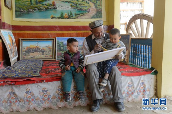 阿卜力克木·麥麥提敏(中)教兩個小孫子畫畫(3月5日攝)。新華社發(丁磊 攝)
